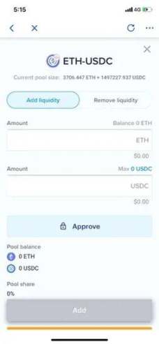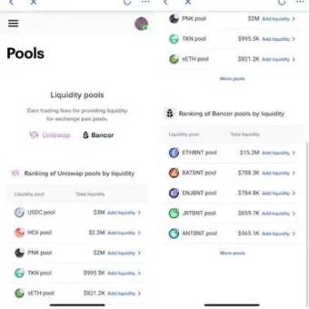 在“Pool”部分中,用户可以向 Uniswap 或 Bancor 的流动性池中添加流动性以获得奖励。将显示两个协议的最高流动性池列表。