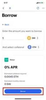 2. 输入贷款金额和抵押品选择以查看预期的抵押金额和年利率。点击“Borrow”。