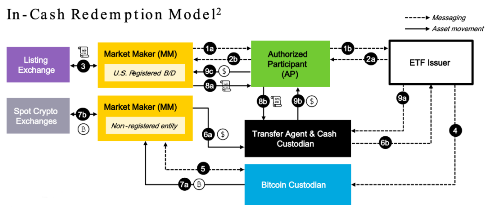 可见,在实物 /BTC 模型下,ETF 发行人只需要处理 ETF 份额和 BTC 的对应关系和记账,而不需要操心他们目前在市场上不断波动的美元价格。