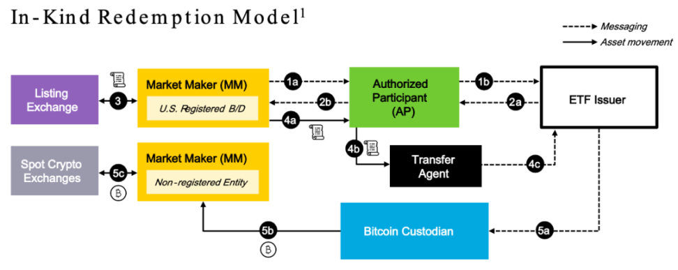 先说说创建。流程起点仍然是从做市商申请新 ETF 份额开始。区别是,审批当天,做市商就要完成一系列操作:在美股市场卖掉 ETF,在加密市场买入 BTC,然后把 BTC 现货上交给 BTC 托管人(即 ETF 发行人)。