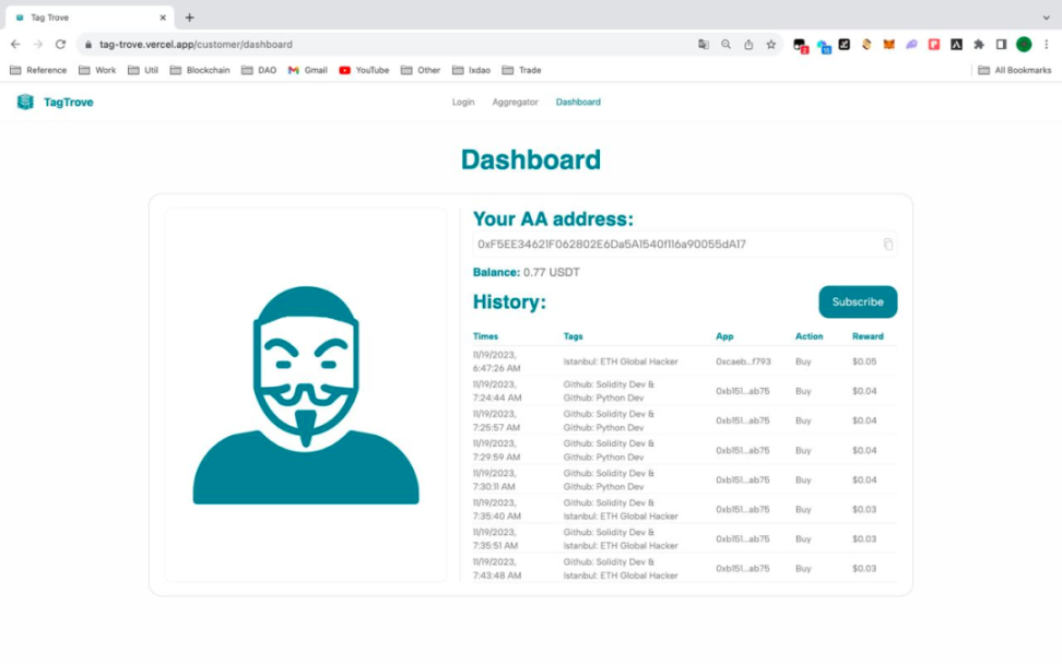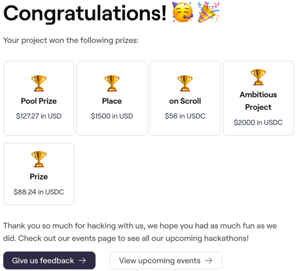在本次比赛中 TagTrove 团队由 Samuel Lin 担任产品经理及队长,0xhardman 担任前端开发,0xJA 担任后端开发,国际友人 Dennis 担任 Presenter 共同夺得了 MaskNetwork 提供的 Most Ambitious Project($2000),WalletConnect 提供的 3rd Prize($1500),以及 Walletconnect、Scroll、Worldcoin 的 Pool Prize(约 $270)。