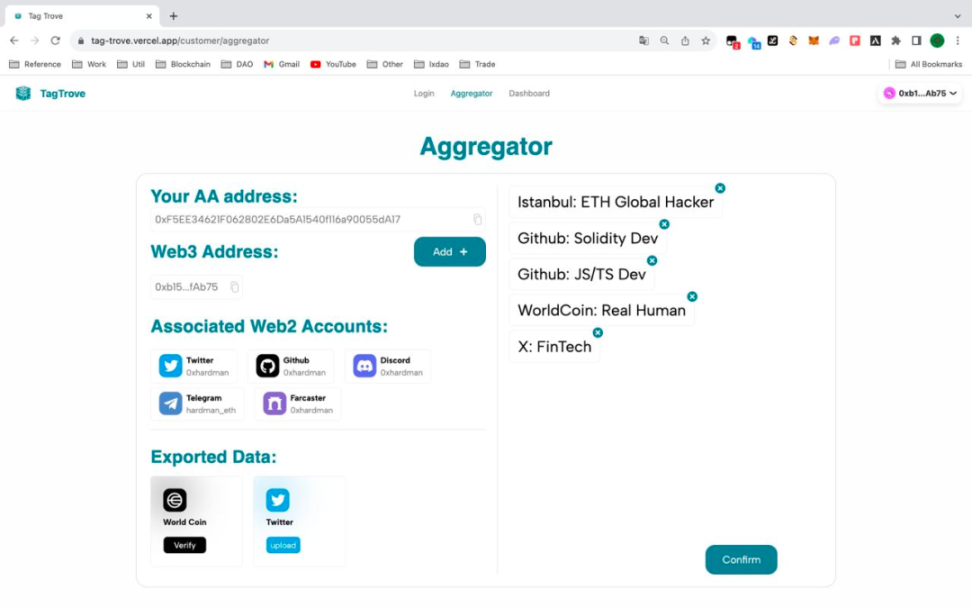 聚合器:用户连接用户的 Web3 地址以及 Web2 账户的信息并生成 Tag,用户可选择是否进行 WorldCoin 的 Real person 认证以及 Twitter 的数据导入,读取地址生成数据。