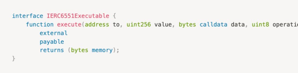 前面提到的 implementation 具体是怎样实现的呢,这是一个例子:https://etherscan.io/address/0x1a0e97dae78590b7e967e725a5c848ed034f5510- 必须实现 IERC6551Executable 接口