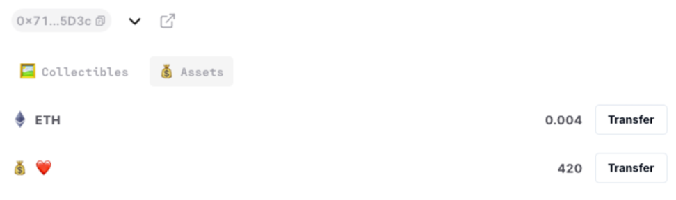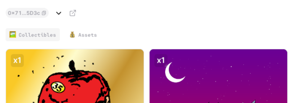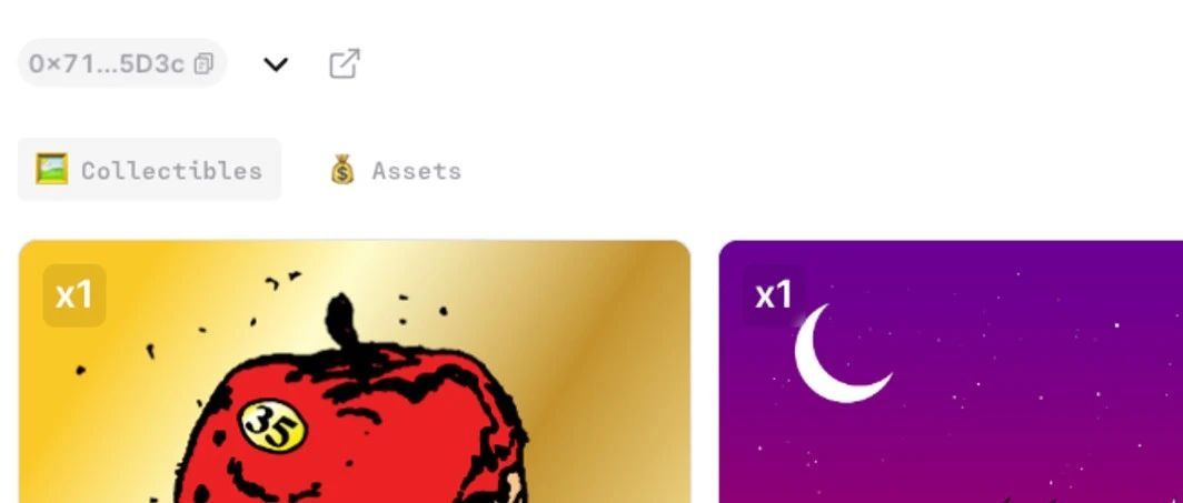 - 可以看到这个 NFT 下绑定的 1 个 TBA,该 TBA 下有 2 种类型资产,Collectibles 表示 NFT(ERC-721 和 ERC-1155),Assets 表示原生代币和 ERC-20 。