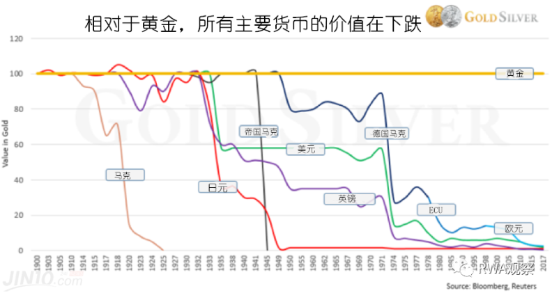 拉到一百年的维度看,各个主流货币价值跳水,只有时间早晚的问题, 没有跳不跳的问题。