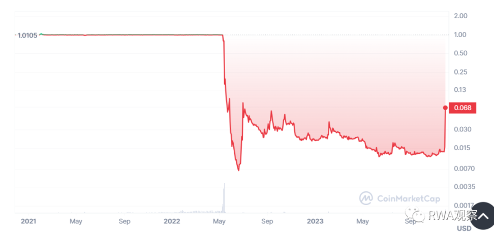 类似USTC(Terra发行的美元)虽然最近有一定热度,但早就不被市场承认了。