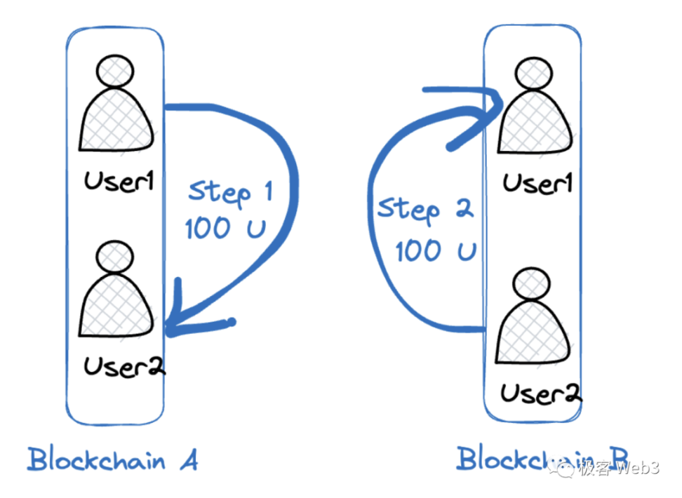 我们来想想,最符合直觉的跨链方法是什么?假如你在 A 链有 100 个 USDT,你希望把它们转移到 B 链上。恰好有一个人在 B 链有 100 个 USDT,他希望把 USDT 转移到 A 链去。你们俩一看这不刚好吗,于是一拍即合。