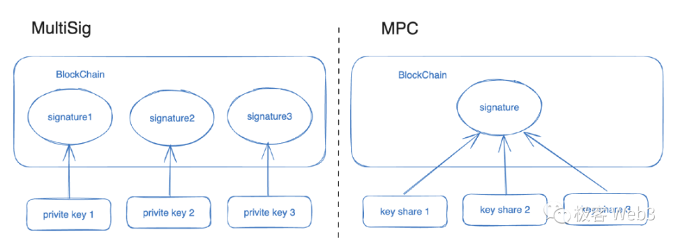比普通多签钱包的保密性更强。当需要签名的时候,由例如 5/7 个私钥碎片各自去签名,多个子签名融合到一块构成最终的一个合法签名。这样一来,链上看到的是一个单一的、普通的签名,你无法分辨它是否来自 MPC 账户,更无法知道背后的签名人是谁,也无法知道私钥碎片的数量和具体的签名规则。
