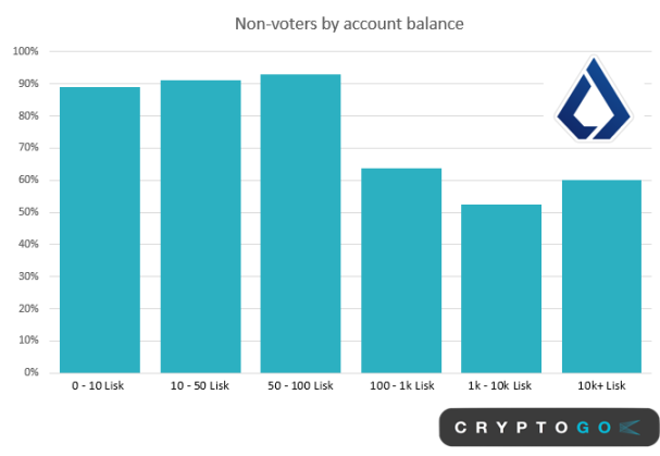 研究非投票者的统计分布也印证了这种顾虑。持币量低于 100 Lisk 的账户中,只有大约 10% 会去投票。由于前面提到的「老选民」只拥有绝对数量很少的 Lisk,他们对这一统计数据有效性的影响微乎其微。