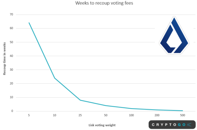 但如果你看一下基于优化投票结果的最高回扣收入,你就会发现上面提到的那些小投资者将幡然醒悟。一个账户余额为 10 Lisk 的选民,在扣除全部费用后,将需要大约 24 周的时间才能重新获得 10 Lisk 的初始余额 含复利。余额为 25 Lisk 的话只需要 8 周,50 Lisk 只需 4 周。