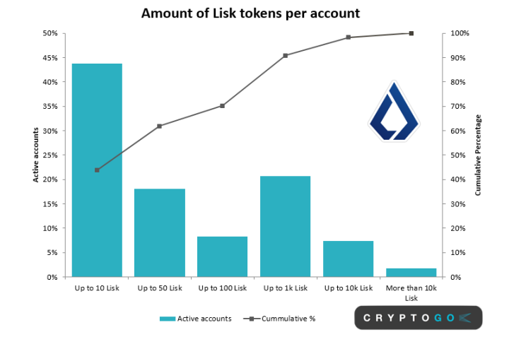 下面的图表概述了 Lisk 网络中财富的分布情况。45% 的账户持有 10 个以内 Lisk,另有 17% 的账户持有 10~50 Lisk。也就是说, 62% 的 Lisk 账户持有不超过 50 个 Lisk。