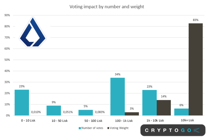 下面的图表显示了投票与投票权重之间的关系。很明显,拥有超过 1 万 Lisk 资本的账户只占所有选票的 6%,但这些选票占到了 83% 以上的权重。相比之下,拥有 10 个以内 Lisk 的账户,占全部选票的 23%,但他们只占总投票权重的 0.01%,实际上并没有发挥任何重要作用。