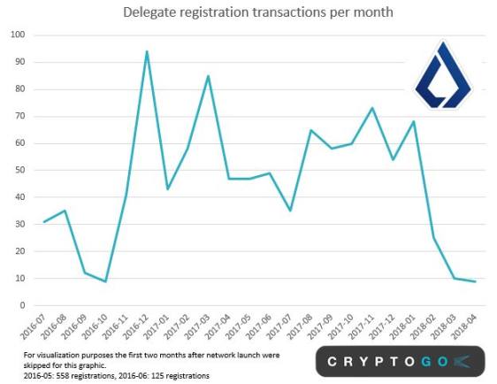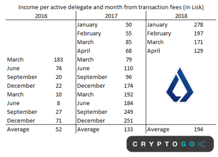 但与区块奖励相比,交易费用无足轻重。下面的图表说明了每个委托人和每月交易费用收入的发展情况。自从 Lisk 网络问世,通过这些费用获得的月收入远远低于通过区块奖励获得的日收入。
