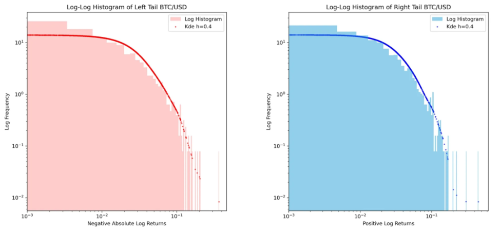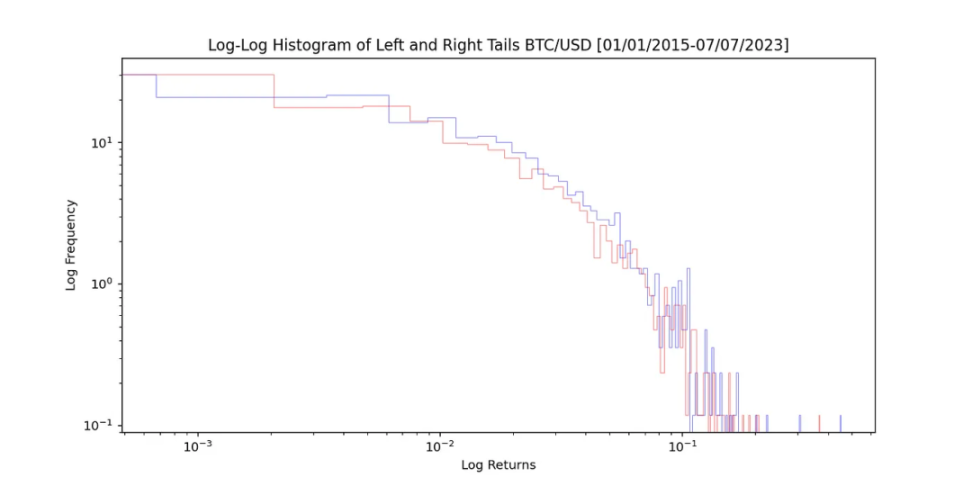 自 2015 年 1 月 1 日起,比特币(BTC)每日收益率的左尾和右尾显示出不对称性,尤其是右尾。