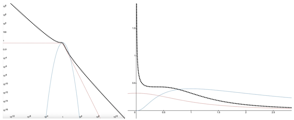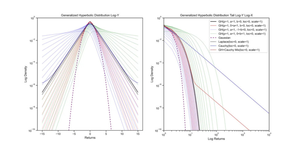 左图:在对数 - 纵坐标图上观察统计分布可以更好地了解其形状。超博拉分布呈现出类似于双曲线的形状,而虚线高斯分布由于 e^-x²/2 项的存在可以看作是一个抛物线。右图:通过在对数 - 对数图上观察分布的尾部,可以更好地了解其特征。幂律分布在对数 - 对数图中不会呈现出衰减的趋势。可以通过将分布组合并使用权重参数来混合不同的分布。
