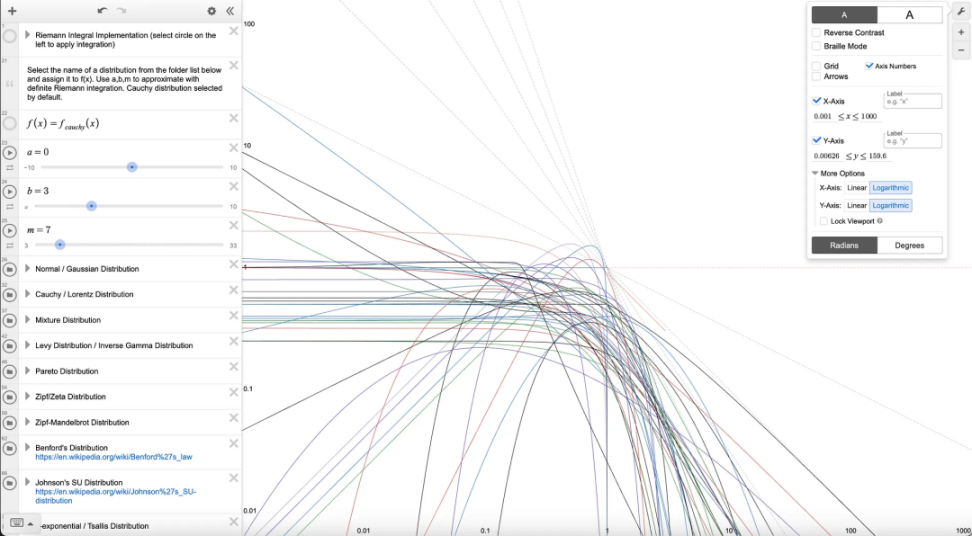 Desmos 的一个有趣特点是可以切换到对数对数图,这样可以看到每个统计分布的尾部特征是如何变化的。