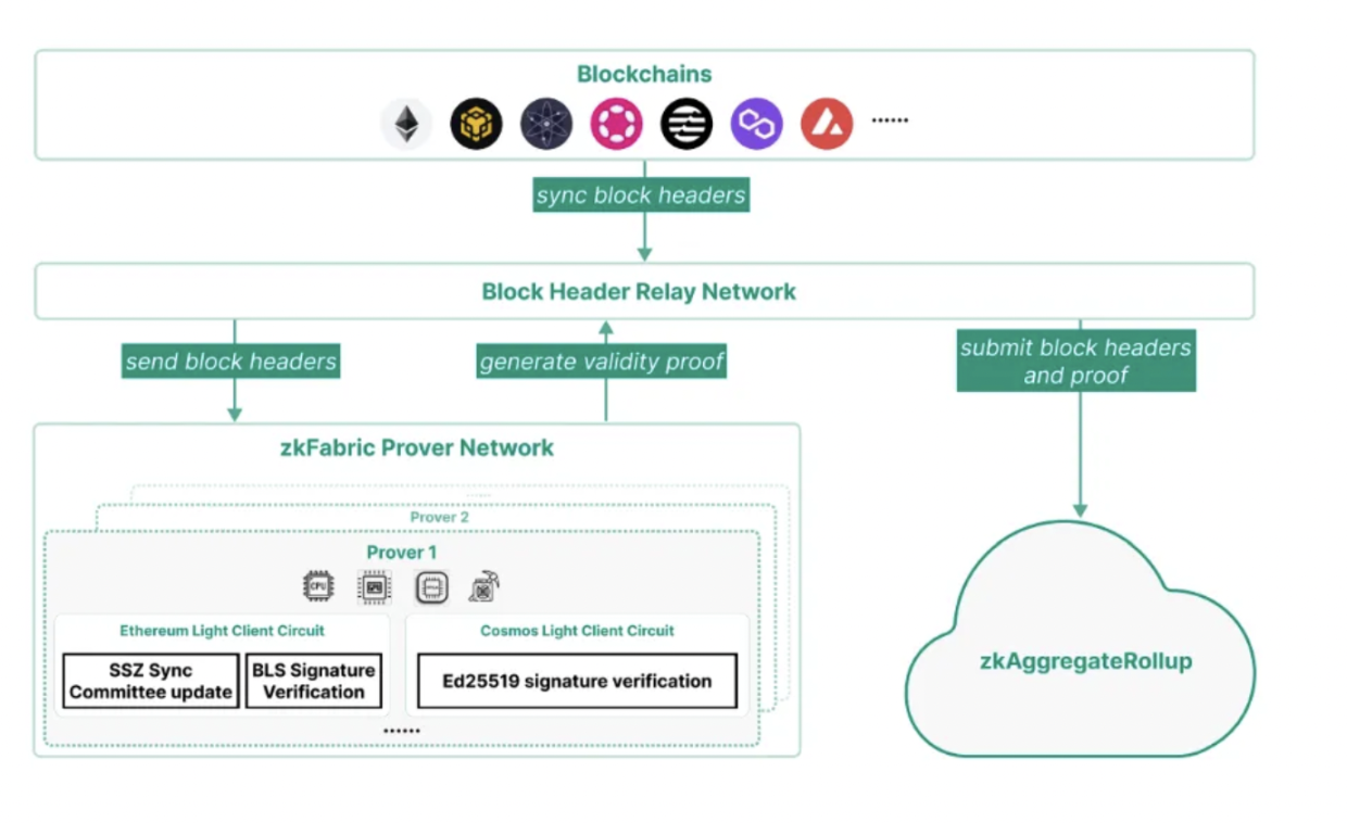 zkFabric Prover 网络为每个区块链的 lightclient 协议实现电路,该网络为区块头生成有效性证明。证明者可利用 GPU、FPGA 和 ASIC 等加速器,最大限度地减少证明时间和成本。