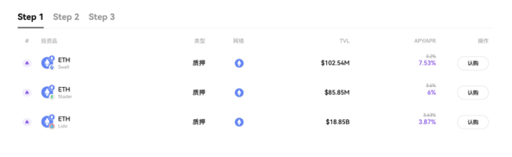 如果用户需求比较简单,仅仅是 ETH 的单币质押需求,那么可以通过参与到 OKX Web3 DeFi 特邀 Lido、Stader、Swell 和 Tranchess 协议提供的加息活动中,获得高 APR。