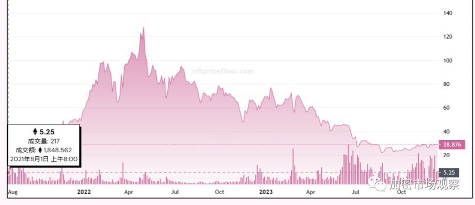 哪怕现在处于 NFT 市场寒冬,无聊猿的市场价格还是早期价格的好几倍,距离高位的回调幅度也优于很多项目了。
