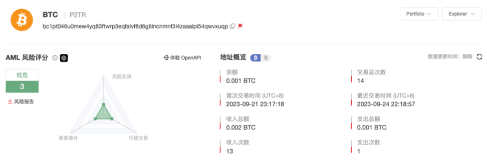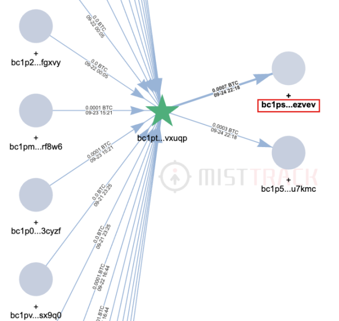 使用 MistTrack 分析发现,受害者 9 月 23 日转入了多笔 ATOM(据受害者描述有 98,000 个)到创建的 ARC20 钱包地址 bc1pt046u0mew4yq83ftwrp3eqfalvf8d6g6lncnmnf3l4zaaalpl54qwvxuqp 中,而这些代币在 9 月 24 日就被转入了黑客的地址 bc1psanyvngxqgwxcssfwryl8mva7em4pmp37jcck2m67xtux8l887js7ezvev。