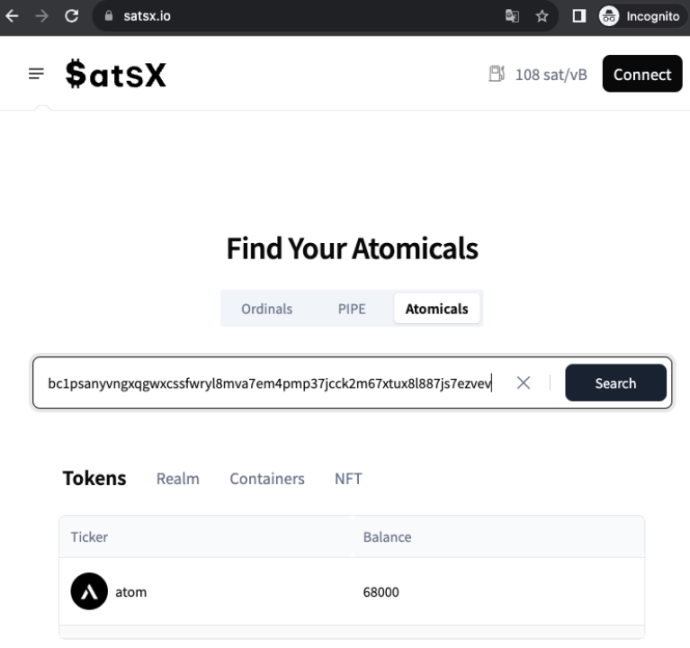 使用 https://satsx.io/ 查询,可以看到目前黑客盗取的 ATOM ARC20 代币还有 68,000 个没有被转移。