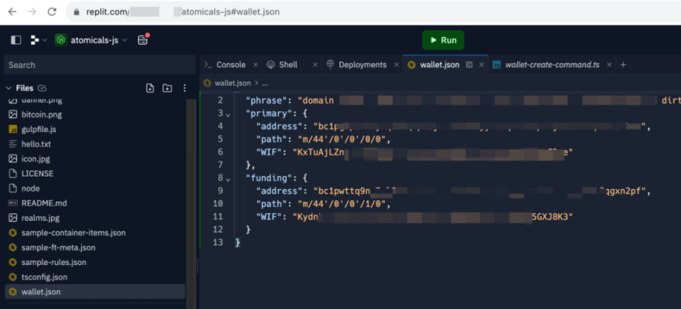 由于 Replit 平台的公开性,在其上部署的代码均是公开的,允许所有人访问。atomicals-js 项目部署运行后会在项目目录生成一个 wallet.json 文件,这个文件包含了如生成的助记词、私钥以及地址等敏感信息。