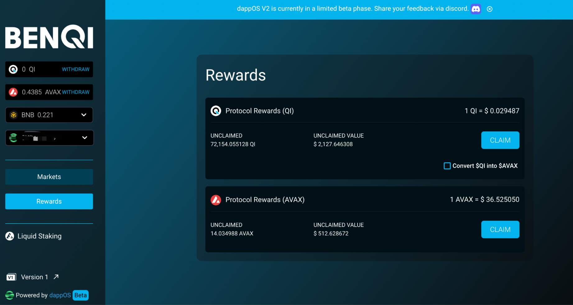 dappOS 同样也成为了交易者使用 Benqi 的绝佳入口,通过 dappOS 统一账户,能够支持用户一键交互 Benqi,并能够从不同的链完成支付、质押等操作,无需手工跨链,奖励会以 \(QI 和 \)AVAX 的形式直接发放到 dappOS v2 统一账户中。