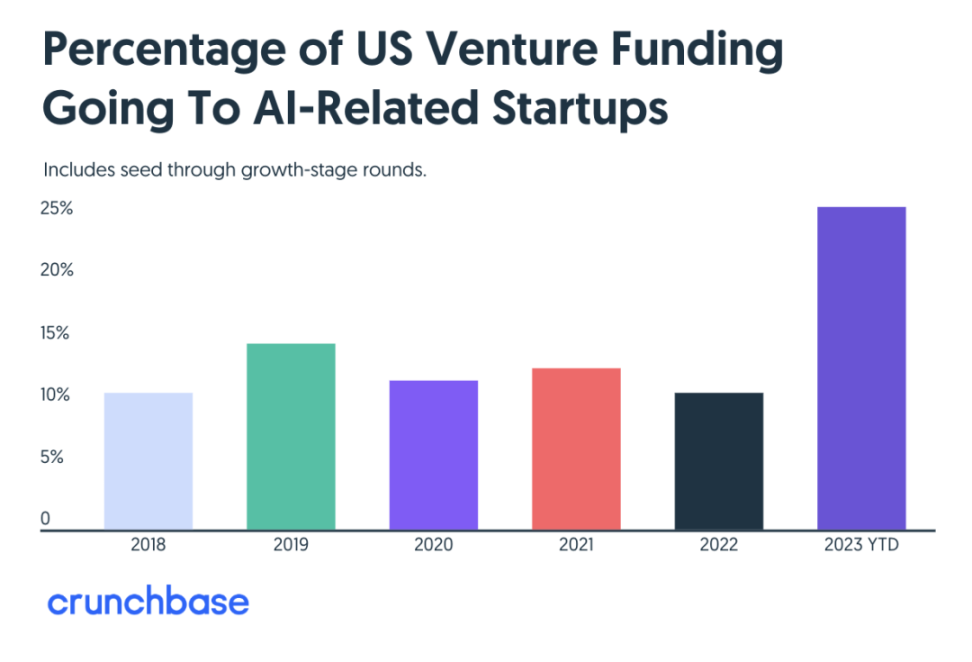 Crunchbase 数据显示,今年所有拿到 VC 投资的美国创业公司里,超过四分之一是 AI 公司。