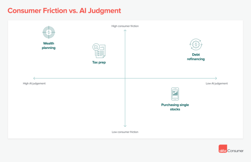 而据 A16Z 推测,AI 对互联网产品的革新将会是渐进性但坚决的。它首先会冲击「用户摩擦高」(手动完成很痛苦)且「判断力要求低」(实现自动化够简单)的产品类别。前者意味着消费者将更有动力尝试新产品,而后者则更能保证为用户带来良好的体验。