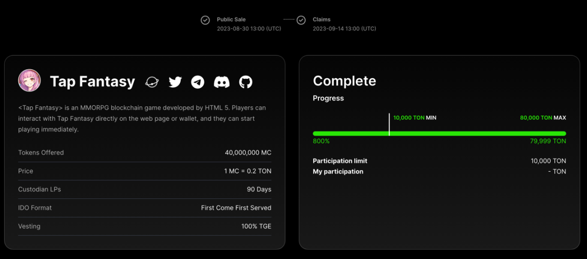并在仍处加密货币熊市的 8 月 30 日以不到半个小时的时间为其募集到价值 10 万美元的启动资金。而 Tap Fantasy 最终也不负众望,当基于 Telegram 小程序的游戏正式上架后,项目代币让 IDO 投资者最高获超 1 倍的利润。