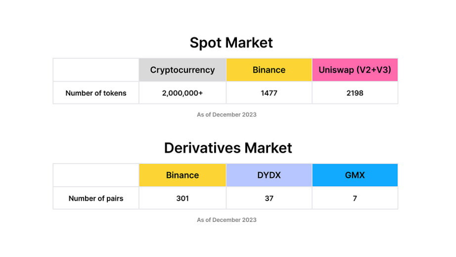 The potential of decentralized derivatives has not been fully realized. According to Coinmarketcap data as of December 2023, over 2 million cryptocurrencies have been issued, with the largest exchange, Binance, offering 1,477 trading pairs for 394 tokens, while the largest decentralized exchange, Uniswap, provides at least 2,198 active trading pairs (v2+v3).