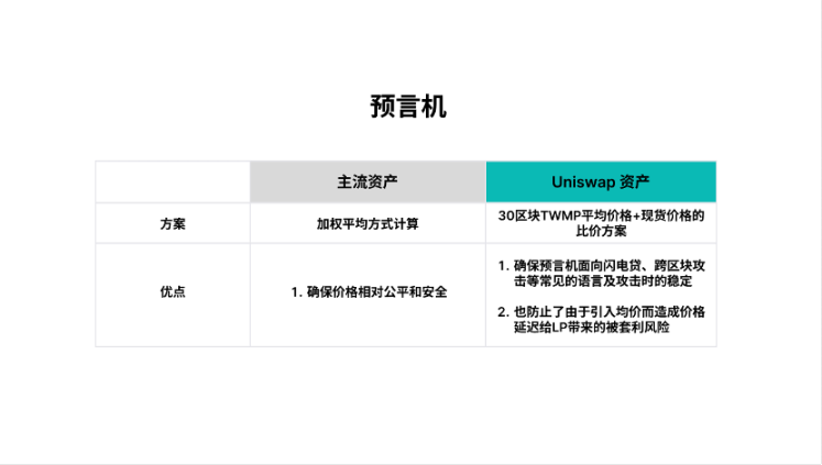 任何衍生品解决方案都无法绕靠预言机与清算问题,在 Sur Protocl 当中同样存在。在主流资产方面,Surf 采用了常见的加权平均方式计算,确保价格相对公平和安全;针对 Uniswap 的资产,Surf 创新的提出了 30 区块 TWMP 平均价格 + 现货价格的比价方案,确保预言机面向闪电贷、跨区块攻击等常见的语言及攻击时的稳定性,也防止了由于引入均价而造成价格延迟给 LP 带来的被套利风险。