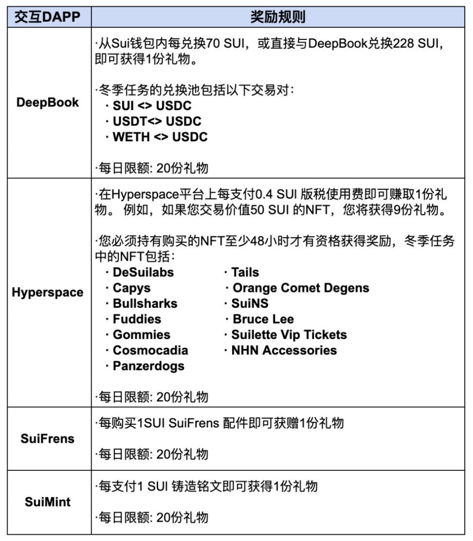 您在冬季任务期间与四个 dApps(DeepBook、Hyperspace、SuiFrens 和 SuiMint)的交互可能会带来令人惊喜的奖励,100 万份礼物,其中包含总共 50 万个 SUI,领完为止。