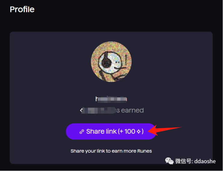 3 点击 share link 获得自己的邀请链接,每邀请一个人参与,可获得 100Runes 积分,如果想多搞积分,就大号拉小号