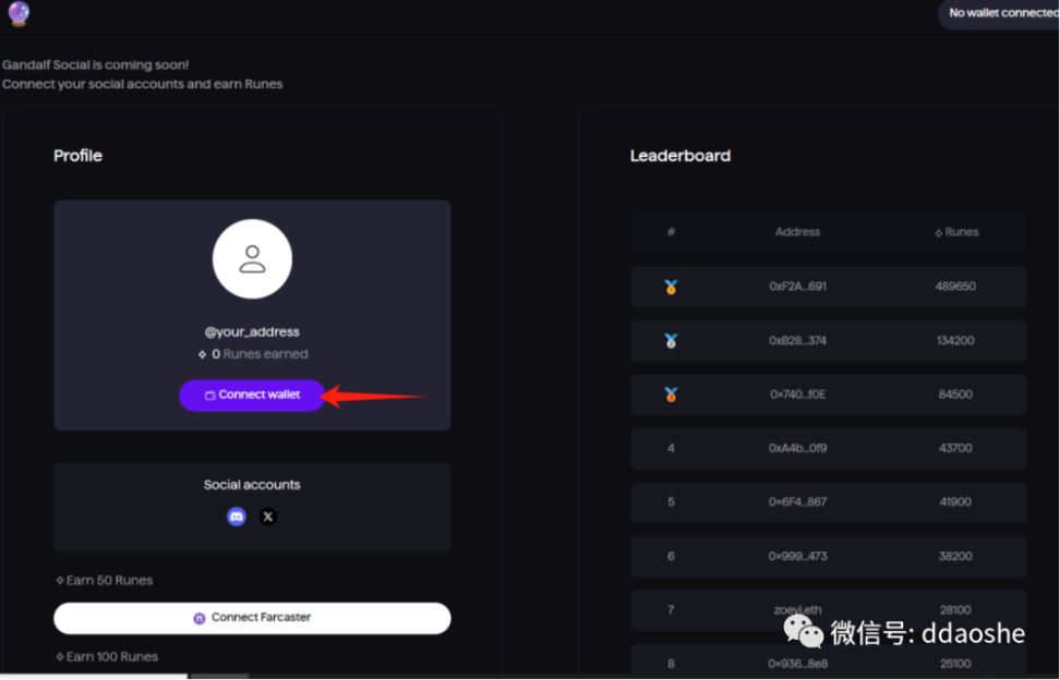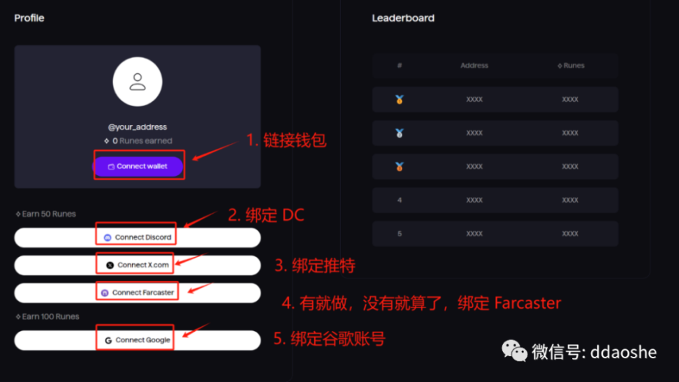 2 分别绑定 dc,推 t,谷歌账号,Farcaster 等,有几个绑定几个,全部绑定完毕即可获得 250 个 Runes 积分