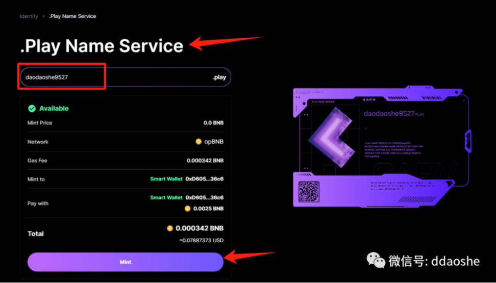 8 返回官网首页,下滑找到.Play Name Service 服务,输入要注册的名字,字符越短价格越高,现在 13 位的限时免费,只需要出 gas 即可,然后点击 mint,等待完成