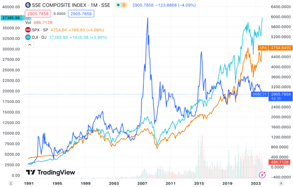 区间终点 2023.12.25: SSE 2905 +21.8%, SPX 4754 +13.4%, DJI 37386 +13.2%