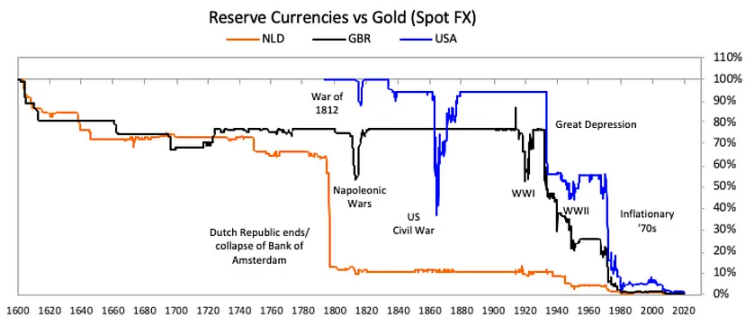 最后,让我们以 Arthur Hayes 放的这张荷兰(橙色)、英国(黑色)、美国(蓝色)法币以黄金本位计价的价值变动图来作为结束吧: