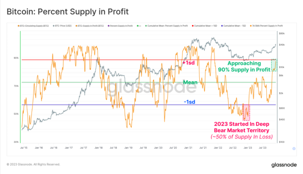 随着 BTC 进入 4 万 -5 万刀区间,近 9 成 BTC 已经处于盈利状态。