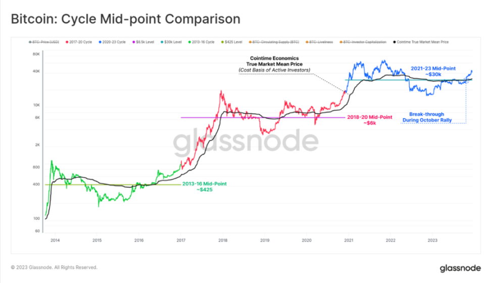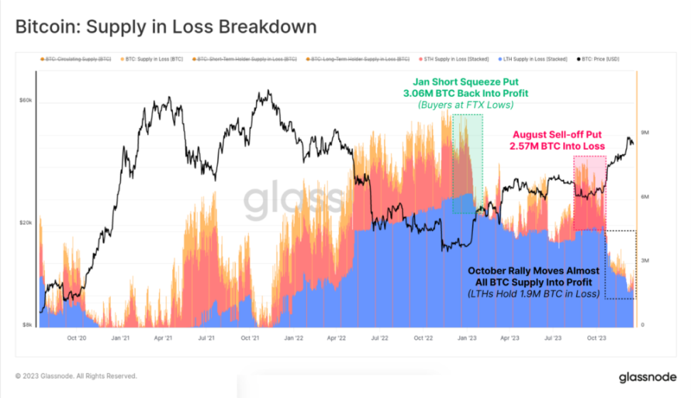 拜 10 月份以来对关键阻力位 3 万刀翻转之后的迅速拉升所赐,上百万枚 BTC 因此得以扭亏为盈。