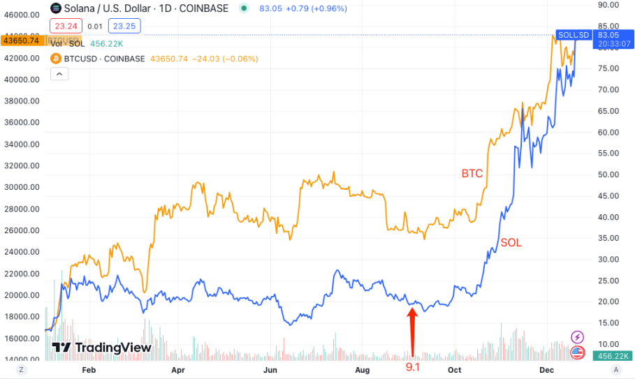 第二,相比于 BTC,它 SOL 是先躺了大半年,然后从 9 月份才开始奋起直追。