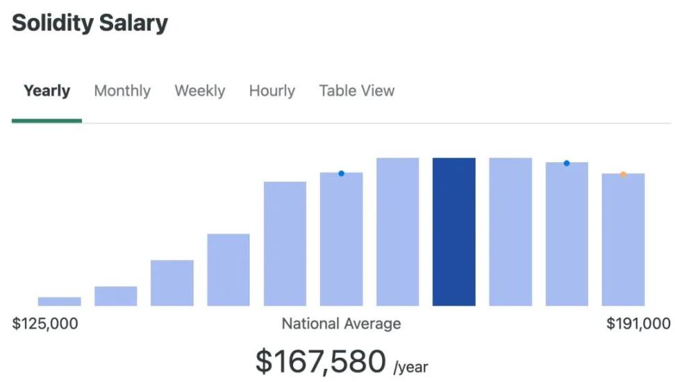 根据最新的数据,美国 Solidity 职位的平均薪资 167,580 美元(约 120 万人民币)