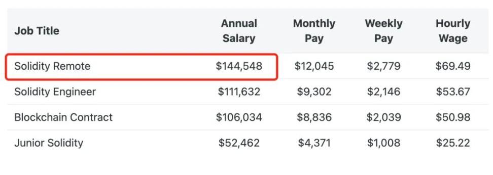 远程岗位年薪是 $144,548(约 100 万人民币), 即便 Solidity 新手也有近 40 万人民币的年薪。