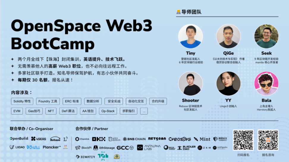 Rebase 社区、4Seas 社区、OpenBuild 社区、 Plancker 社区、Lingo3 、LXDAO 、HERSTORY 和登链社区,我们共同决定组织线下集训营,通过沉浸式的集中学习强化开发和英语能力,期望能帮助华人开发者更多的参与到项目中,在 web3 世界发光发热
