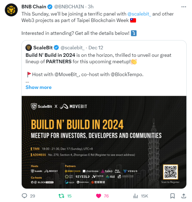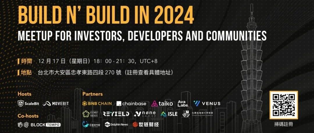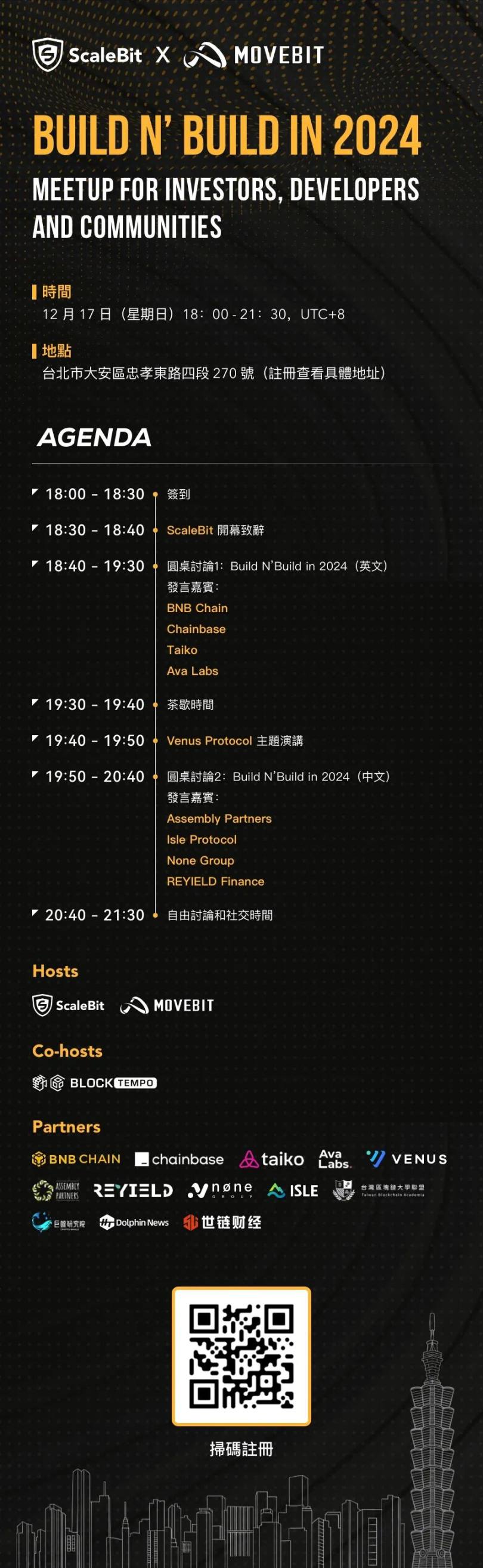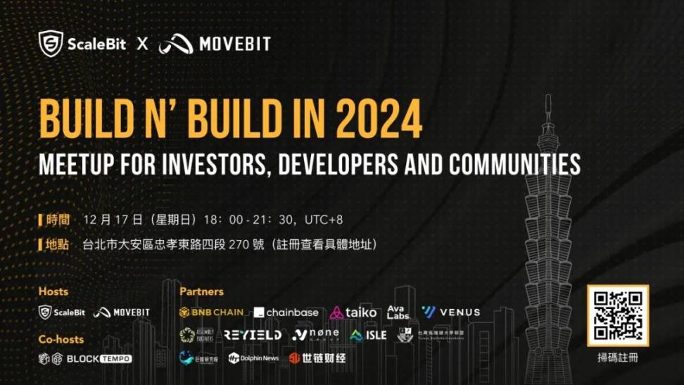 由 Move 生态安全专家 #MoveBit,携手 Web3 Mass Adoption 区块链安全解决方案提供商 #ScaleBit 以及中文区块链媒体领导品牌 #BlockTempo 将会在台北区块链周 2023 期间共同举办「Build N' Build in 2024」。值得一提的是,本次活动还特别邀请到了 BNB Chain 官方分享技术创新与未来趋向。
