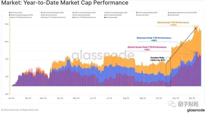 2023 年对于数字资产来说是不可思议的一年,比特币上涨超过 172% ,最大回调幅度不到 20% ,净资本流入 BTC、 ETH 和稳定币。