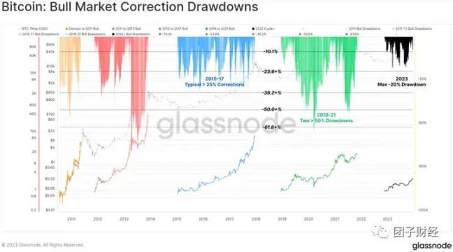 2023 年市场的显着特征之一是所有价格回调和调整的深度都非常浅。从历史上看,BTC 的熊市复苏和牛市上升趋势期间通常会从局部高点回调至少 -25% ,许多例子甚至超过 -50% 。