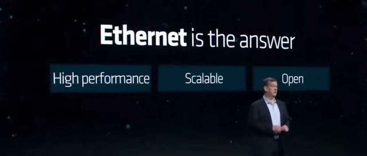 AMD 全面拥抱以太网。无论是从显卡服务器设计亦或是网络架构上,AMD 全面拥抱“开放”理念,服务器采用标准化设计,可以兼容任何客户的集群。在网络方面,内部互联的 Infinity Fabric 协议将开放给合作的交换机厂商与战略伙伴。同时,在跨服务器的显卡连接上,AMD 旗帜鲜明的指出“Ethernet is the answer”,以太网将成为 AMD 用于构建集群的协议。相比于业界的另一主流协议 IB,AMD 认为以太网拥有更好的性能,更好的大规模集群能力,以及最为核心的开放性。