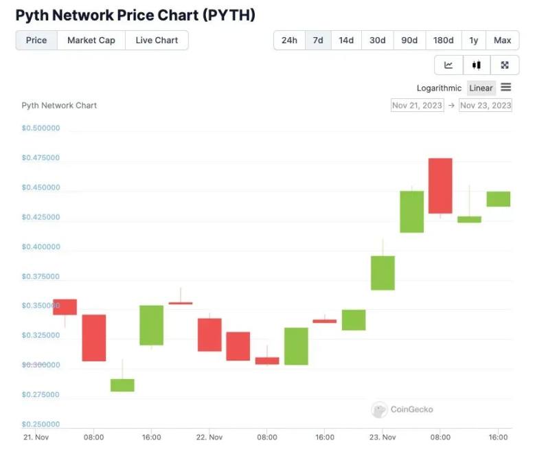 Pyth Network 空投:DeFi 预言机网络 Pyth Network 于 11 月 20 日首次亮相市场,初始交易价格为 $0.53 ,并保持了强劲的交易量。自上线以来,PYTH 代币交易价格已稳定在 $0.4 以上,交易量超过 2.26 亿美元。
