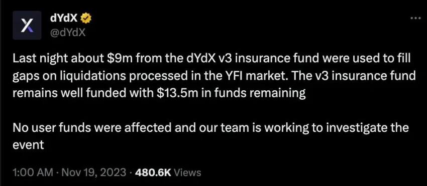 - 去中心化衍生品交易平台 dYdX 因涉嫌攻击而损失 900 万美元保险:dYdX 平台上的 YFI 代币在一日内创下约 45% 跌幅。暴跌影响了 dYdX 上的多头头寸,让 dYdX 上的仓位产生了连环清算,近 3800 万美元的资金被清算。由于本次下跌的速度极快,一度出现了资金缺口,而 dYdX V3 保险基金的约 900 万美元被用于填补 YFI 市场清算的缺口。首席执行官 Antonio Juliano 将此次事件描述为一次有预谋的市场操纵,并保证用户资金安全,同时表示正在进行全面调查。